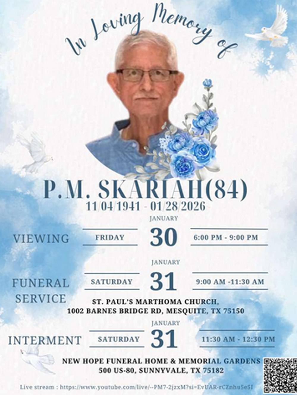 ജനുവരി 28 ബുധനാഴ്ച നിര്യാതനായ പി എം സ്കറിയാ (84) യുടെ പൊതു ദർശനം ജനുവരി 30 വെള്ളിയാഴ്ച വൈകിട്ട് 6 മണി മുതൽ 9 മണിവരെ ഡാളസ് സെന്റ് പോൾസ് മാർത്തോമാ ചർച്ചിൽ വെച്ച് നടത്തപ്പെടും