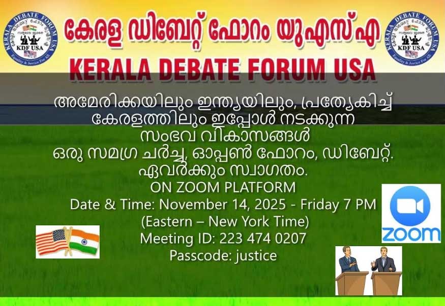 ഹ്യൂസ്റ്റൻ: അമേരിക്കയിലെയും ഇന്ത്യയിലെയും പ്രത്യേകിച്ച് കേരളത്തിലെ ഇപ്പോഴത്തെ രാഷ്ട്രീയ സാമൂഹ്യ സാംസ്കാരിക മണ്ഡലങ്ങളിലെ സംഭവ വികാസങ്ങളെ ആസ്പദമാക്കി – കേരള ഡിബേറ്റ് ഫോറം യുഎസ്എ, ഒരു സമഗ്രചർച്ചാ സമ്മേളനം, സംവാദം, സൂം (ZOOM) ഫ്ലാറ്റ് ഫോമിൽ, നവംബർ 14, 2025 – 7 PM (Eastern Time) സംഘടിപ്പിക്കുന്നു.