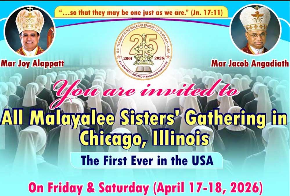 ചിക്കാഗോ: സിറോ മലബാർ ചിക്കാഗോ രൂപതയുടെ ഇരുപത്തിയഞ്ചാം വാർഷികാഘോഷങ്ങളുടെ ഭാഗമായി അമേരിക്കയിൽ ‘ഓൾ മലയാളി സിസ്റ്റേഴ്സ് സംഗമം’ 2026, ഏപ്രിൽ 17, 18 തീയതികളിൽ ചിക്കാഗോയിൽ അരങ്ങേറും. അമേരിക്കയിലെ സേവനമനുഷ്ഠിക്കുന്ന മലയാളി സമർപ്പിത സന്യാസിനികളുടെ ചരിത്രത്തിൽ ആദ്യമായാണ് ഇത്തരമൊരു വിപുലമായ സംഗമം സംഘടിപ്പിക്കപ്പെടുന്നത്.