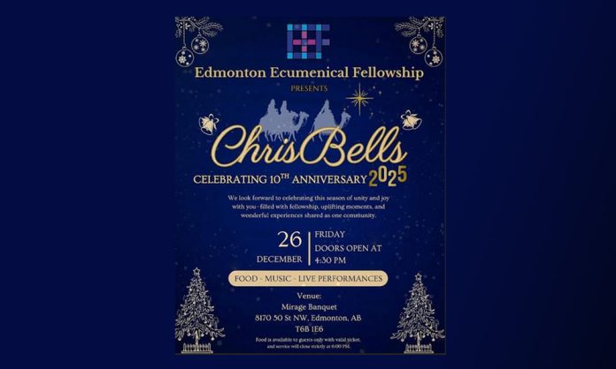 പത്താം വാർഷികാഘോഷങ്ങളുടെ ഭാഗമായി സംഘടിപ്പിക്കുന്ന വാർഷിക ക്രിസ്മസ് സംഗമം ‘ക്രിസ്ബെൽസ് 2025 ‘ ഡിസംബർ 26-ന് 50-ാം സ്ട്രീറ്റിലെ മിറേജ് ബാങ്ക്വറ്റ് ഹാളിൽ നടക്കും. ഫോർട്ട് സസ്‌കാച്വൻ എം.പി ഗാർനെറ്റ് ജീനിയസ് ആഘോഷങ്ങൾ ഉദ്ഘാടനം ചെയ്യും, അതോടൊപ്പം ഫെലോഷിപ്പിന്റെ പുതിയ വെബ്സൈറ്റിന്റെ പ്രകാശനവും അദ്ദേഹം നിർവ്വഹിക്കും. എഡ്മന്റൺ എക്യുമെനിക്കൽ ഫെലോഷിപ്പ് പ്രസിഡന്റ് റവ. തോമസ് പൂതിയോട്ട് ക്രിസ്മസ് സന്ദേശം നൽകും.