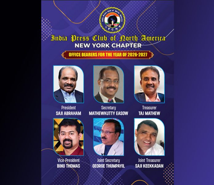 ന്യൂയോർക്ക്:കഴിഞ്ഞ രണ്ട് പതിറ്റാണ്ടിലധികമായി പ്രവർത്തിക്കുന്ന അമേരിക്കയിലെ മാധ്യമ പ്രവർത്തകരുടെ ഏറ്റവും വലിയ സംഘടനയായ ഇന്ത്യാ പ്രസ്സ് ക്ലബ്ബ് ഓഫ് നോർത്ത് അമേരിക്കയുടെ (IPCNA) ന്യൂയോർക്ക് ചാപ്റ്ററിനെ അടുത്ത രണ്ടു വർഷക്കാലം നയിക്കുവാനുള്ള പുതിയ നേതൃത്വത്തെ തെരഞ്ഞെടുത്തു. നിലവിലെ പ്രസിഡൻറ് ഷോളി കുമ്പിളുവേലിയുടെ അദ്ധ്യക്ഷതയിൽ ഡിസംബർ 21 ഞായറാഴ്ച റോക്ലാൻഡ് കൗണ്ടിയിലുള്ള മലബാർ പാലസ് റെസ്റ്റോറന്റിൽ കൂടിയ ന്യൂയോർക്ക് ചാപ്റ്റർ ദ്വൈവാർഷിക പൊതുയോഗത്തിൽ വച്ച് 2026-2027 വർഷം പ്രസ് ക്ലബ്ബിനെ നയിക്കുവാൻ സജി എബ്രഹാമിനെ പ്രസിഡന്റായും, മാത്യുക്കുട്ടി ഈശോയെ സെക്രട്ടറിയായും താജ് മാത്യുവിനെ ട്രഷററായും, ബിനു തോമസിനെ വൈസ് പ്രസിഡന്റായും, ജോർജ് തുമ്പയിലിനെ ജോയിന്റ് സെക്രട്ടറിയായും, സജി കീക്കാടനെ ജോയിന്റ് ട്രഷററായും ഏകകണ്ഠമായി തെരഞ്ഞെടുത്തു.