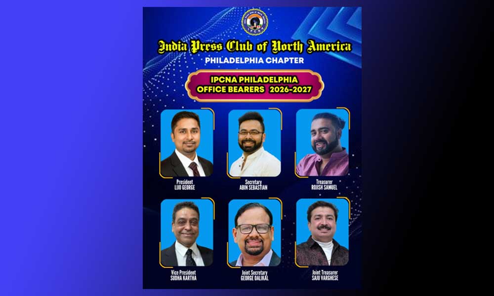 ഫിലാഡൽഫിയ: ഇന്ത്യ പ്രസ് ക്ലബ് ഓഫ് നോർത്ത് അമേരിക്ക ഫിലാഡൽഫിയ ചാപ്റ്ററിന്റെ 2026-27 വർഷങ്ങളിലേക്കുള്ള പുതിയ ഭാരവാഹികൾ ചുമതലയേറ്റു. ലിജോ ജോർജ് പ്രസിഡണ്ട്, അബിൻ സെബാസ്റ്റ്യൻ സെക്രട്ടറി, ട്രെഷറർ റോജിഷ് സാമുവൽ, വൈസ് പ്രസിഡണ്ട് സുധ കർത്താ, ജോയിന്റ് സെക്രട്ടറി ജോർജ് ഓലിക്കൽ, സജു വർഗീസ് ജോയിന്റ് ട്രഷറർ എന്നിവരായിരിക്കും പുതിയ ഭാരവാഹികൾ.
