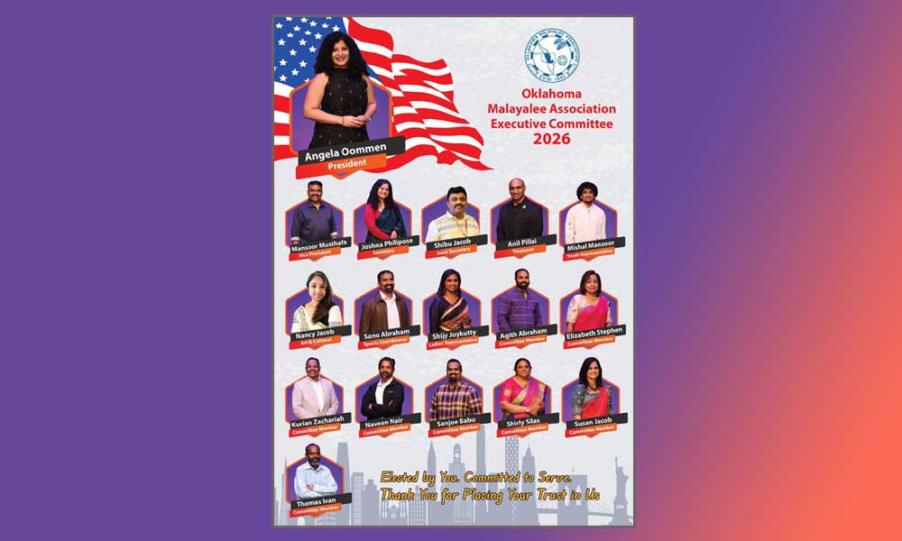 ഒക്കലഹോമ സിറ്റി, ഒക്കലഹോമ യിലുടനീളമുള്ള മലയാളി സമൂഹത്തിന് ഐക്യത്തിന്റെയും സേവനത്തിന്റെയും സാംസ്കാരിക ആഘോഷത്തിന്റെയും പുതിയ അധ്യായമായി 2026-ലേക്കുള്ള പുതിയ നേതൃത്വ കമ്മിറ്റി രൂപീകരിച്ചതായി ഒക്ലഹോമ മലയാളി അസോസിയേഷൻ (ഒഎംഎ) അഭിമാനത്തോടെ പ്രഖ്യാപിക്കുന്നു. പുതുക്കിയ കാഴ്ചപ്പാടോടെയും കൂട്ടായ മനോഭാവത്തോടെയും, പുതുതായി തിരഞ്ഞെടുക്കപ്പെട്ട കമ്മിറ്റി ഔദ്യോഗികമായി ചുമതലയേറ്റു, കേരളത്തിന്റെ സമ്പന്നമായ പൈതൃകം സംരക്ഷിക്കുക, സമൂഹ ബന്ധങ്ങൾ ശക്തിപ്പെടുത്തുക, സാംസ്കാരിക, സാമൂഹിക, ജീവകാരുണ്യ പ്രവർത്തനത്തിനായി അർത്ഥവത്തായ വേദികൾ സൃഷ്ടിക്കുക എന്നീ ഒഎംഎയുടെ ശാശ്വത ദൗത്യം മുന്നോട്ട് കൊണ്ടുപോകുന്നു. ഈ പുതിയ നേതൃത്വത്തിന്റെ ചുക്കാൻ പിടിക്കുന്നത് പ്രസിഡന്റ് എയ്ഞ്ചലാ ഉമ്മനാണ്,