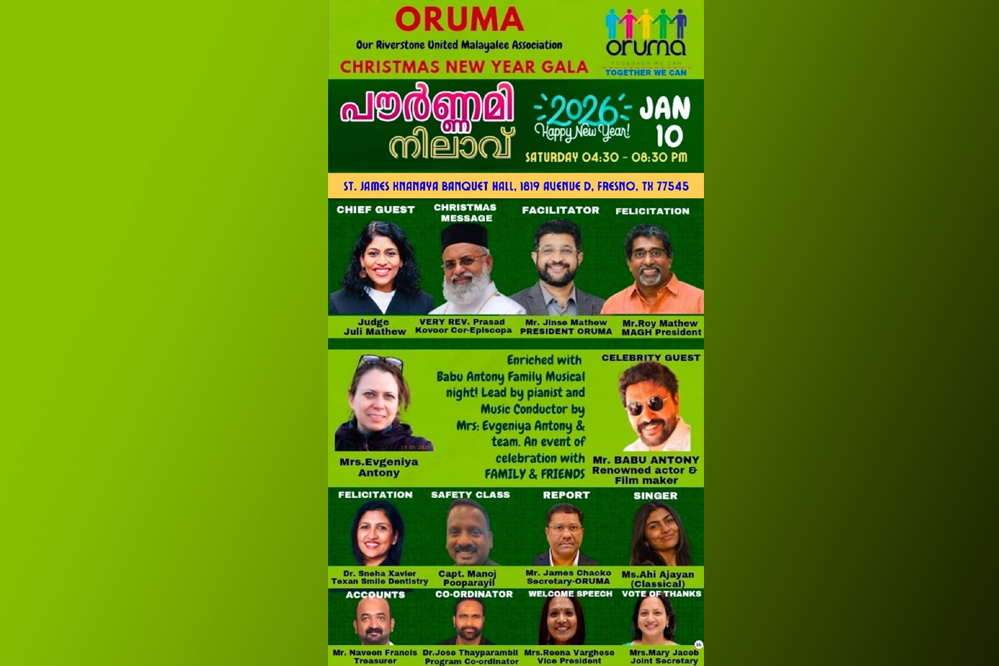 ബന്ധപ്പെടേണ്ട നമ്പർ: ജിൻസ് മാത്യു,പ്രസിഡൻ്റ് ഒരുമ 832 278 9858.