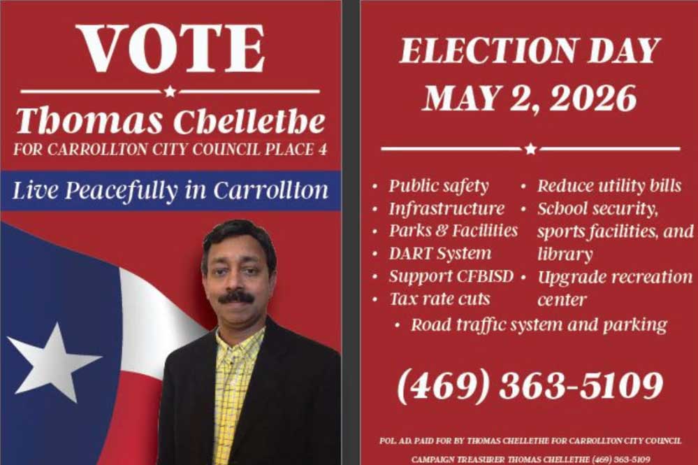 കരോൾട്ടൺ (ടെക്സസ്): അമേരിക്കയിലെ കാരൾട്ടൺ സിറ്റി കൗൺസിലിലേക്ക് നടക്കുന്ന തിരഞ്ഞെടുപ്പിൽ പ്രമുഖ മലയാളി പൊതുപ്രവർത്തകൻ തോമസ് ചെള്ളേത്ത് മത്സരിക്കുന്നു. ഇന്ത്യൻ ക്രീക്ക് ഹോം ഓണേഴ്സ് അസോസിയേഷൻ വൈസ് പ്രസിഡന്റ് എന്ന നിലയിലും വിവിധ സാമൂഹിക സംഘടനകളിലെ സജീവ സാന്നിധ്യമായും ശ്രദ്ധേയനായ അദ്ദേഹം, നഗരത്തിന്റെ വിപുലമായ വികസന പദ്ധതികൾ മുൻനിർത്തിയാണ് ജനങ്ങളെ സമീപിക്കുന്നത്.