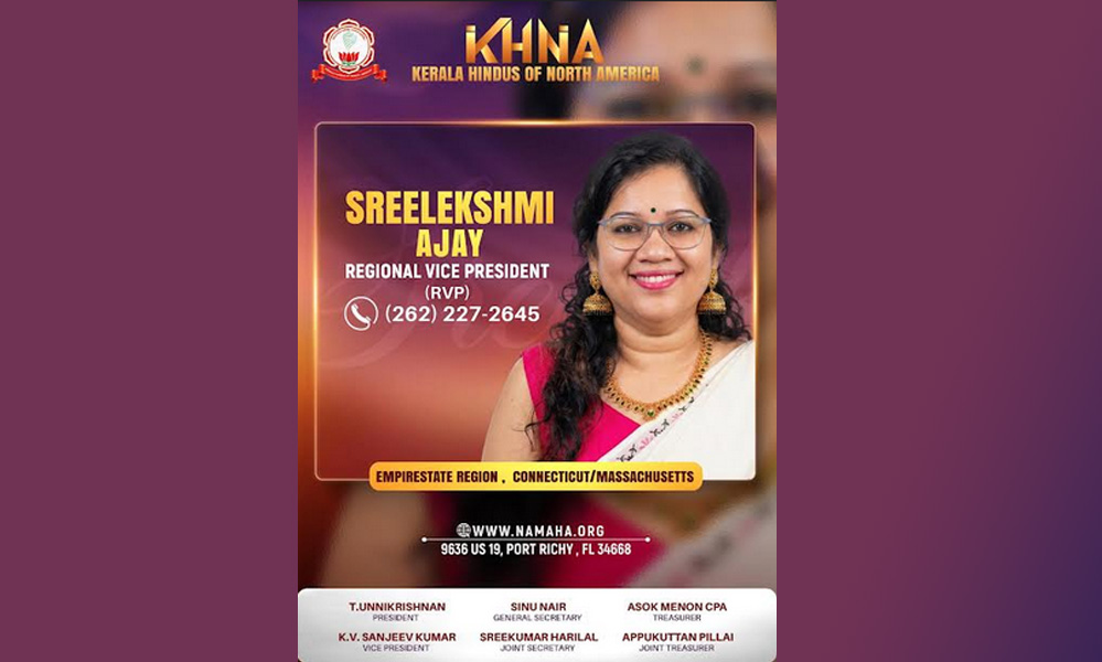 കണക്റ്റിക്കട്ട്: നോർത്ത് അമേരിക്കയിലെ മലയാളി ഹിന്ദുക്കളുടെ കേന്ദ്ര സംഘടനയായ കെ.എച്ച്.എൻ.എ (KHNA) യുടെ കണക്റ്റിക്കട്ട്, മസാച്യുസെറ്റ്സ് റീജിയണൽ വൈസ് പ്രസിഡന്റായി (RVP) ശ്രീലക്ഷ്മി അജയിനെ നാമനിർദേശം ചെയ്തു. കഴിഞ്ഞ രണ്ട് വർഷമായി ഈ മേഖലയിൽ സംഘടനയുടെ പ്രവർത്തനങ്ങൾ ഏകോപിപ്പിക്കുന്നതിൽ ആർ.വി.പി എന്ന നിലയിൽ ശ്രീലക്ഷ്മി സ്തുത്യർഹമായ സേവനമാണ് കാഴ്ചവെക്കുന്നത്.