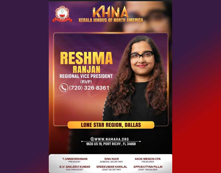 ഡാളസ് (ടെക്സസ്): കേരള ഹിന്ദൂസ് ഓഫ് നോർത്ത് അമേരിക്ക (കെ.എച്ച്.എൻ.എ) യുടെ ഡാളസ് റീജിയണൽ വൈസ് പ്രസിഡന്റായി (RVP) പാലക്കാട് സ്വദേശിനിയായ ശ്രീമതി രേഷ്മ രഞ്ജൻ നിയമിതയായി. നിലവിൽ ഡാളസിനടുത്തുള്ള ഫേറ്റിൽ താമസിക്കുന്ന രേഷ്മ, സേവനപരതയും ക്രിയാത്മകതയും കൊണ്ട് അമേരിക്കയിലെ മലയാളി സമൂഹത്തിൽ ശ്രദ്ധേയമായ വ്യക്തിത്വമാണ്.