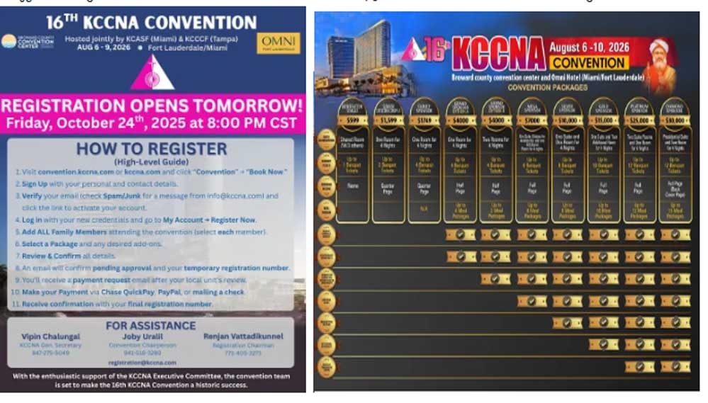 ഡാളസ്: വടക്കേ അമേരിക്കയിലെ ക്നാനായ സമുദായം വളരെയേറെ ആവേശത്തോടെ കാത്തിരിക്കുന്ന ഫ്ലോറിഡയിലെ ഫോർട്ട് ലോഡർഡെയിലെ ബ്രോവാർഡ് കൗണ്ടി കൺവെൻഷൻ സെൻറ്ററിൽ 2026 ആഗസ്റ്റ് 6 മുതൽ 10 വരെ നടക്കുന്ന 16-ാമത് കെ.സി.സി.എൻ.എ നാഷണൽ കൺവെൻഷൻറെ രെജിസ്ട്രേഷൻ ഒക്ടോബർ 24 വെള്ളിയാഴ്ച വൈകിട്ട് 8 മണിക്ക് (സെൻട്രൽ ടൈം) ആരംഭിക്കുമെന്ന് കെ.സി.സി.എൻ.എ ജനറൽ സെക്രട്ടറി വിപിൻ ചാലുങ്കൽ അറിയിച്ചു. ഓംനി ഹോട്ടലിലെ റൂമുകൾ പരിമിതമായതിനാൽ, പ്രത്യേകിച്ച് ഡബിൾ/ക്വീൻ റൂമുകൾ, പണം അടച്ച ക്രമത്തിൽ ആദ്യം രജിസ്റ്റർ ചെയ്യുന്നവർക്ക് മുൻഗണനാ അടിസ്ഥാനത്തിൽ അനുവദിക്കുന്നതാണ്.