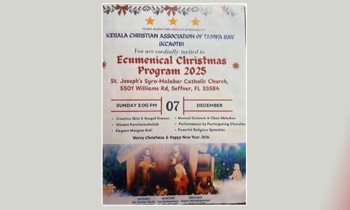 കേരളാ ക്രിസ്ത്യന്‍ അസോസിയേഷന്‍ ഓഫ് റ്റാമ്പാ ബേ എക്യൂമിനിക്കലിന്റെ ക്രിസ്തുമസ് ആഘോഷം ഞായറാഴ്ച