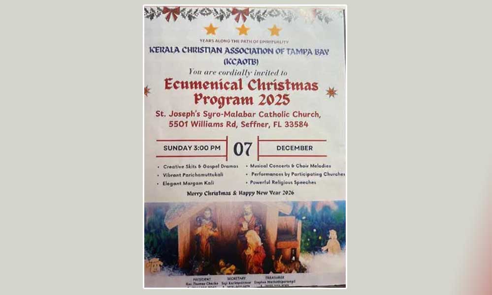 ഡിസംബര്‍ 7 ഞായറാഴ്ച 3 മണിക്ക് സെന്റ് ജോസഫ് സീറോ മലബാര്‍ കാത്തലിക്ക് ദേവാലയഹാളില്‍ (5501 വില്യംസ് റോഡ്, സെഫ്‌നര്‍, ഫ്‌ളോറിഡ, 33584) വച്ച് പ്രാര്‍ത്ഥനയോടെ പരിപാടികള്‍ ആരംഭിക്കും.