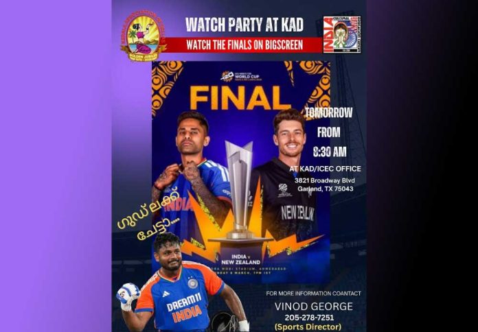 ഡാളസ് സമയം ഞായറാഴ്ച രാവിലെ 8: 30ന് ഫൈനൽ മത്സരം ആരംഭിക്കും. ലോക കപ്പ് ക്രിക്കറ്റ് ഫൈനൽ മത്സരത്തിന്റെ വാച്ച് പാർട്ടി കേരള അസോസിയേഷൻ ഓഫ് ഡാളസിന്റെ ഗാർലന്റിലുള്ള ഓഡിറ്റോറിയത്തിൽ വച്ച് നടത്തപ്പെടും. ടി 20 ലോക കപ്പ് ഫൈനൽ ക്രിക്കറ്റ് മാച്ച് കാണുവാൻ എല്ലാ ക്രിക്കറ്റ് പ്രേമികളെയും സംഘാടകർ ക്ഷണിക്കുന്നു. പ്രവേശനം സൗജന്യമാണ്.