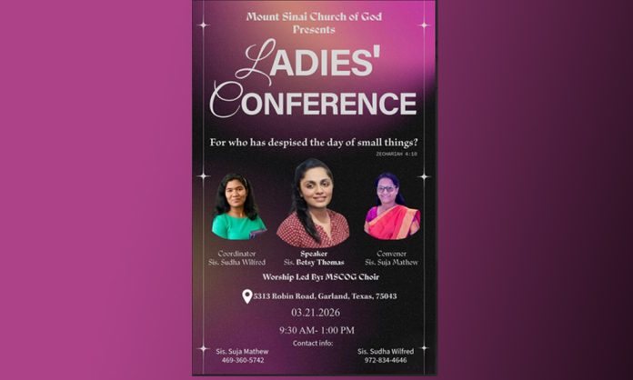 ഗാർലാൻഡ് (ഡാളസ് )മൗണ്ട് സീനായ് ചർച്ച ഓഫ് ഗോഡ് സഭയുടെ നേതൃത്വത്തിൽ ഗാർലൻഡിൽ വനിതാ സമ്മേളനം സംഘടിപ്പിക്കുന്നു. 2026 മാർച്ച് 21-ന് രാവിലെ 9:30 മുതൽ ഉച്ചയ്ക്ക് 1:00 വരെ 5313 Robin Road, Garland, Texas എന്ന വിലാസത്തിലുള്ള സഭയിൽ സമ്മേളനം നടക്കും.