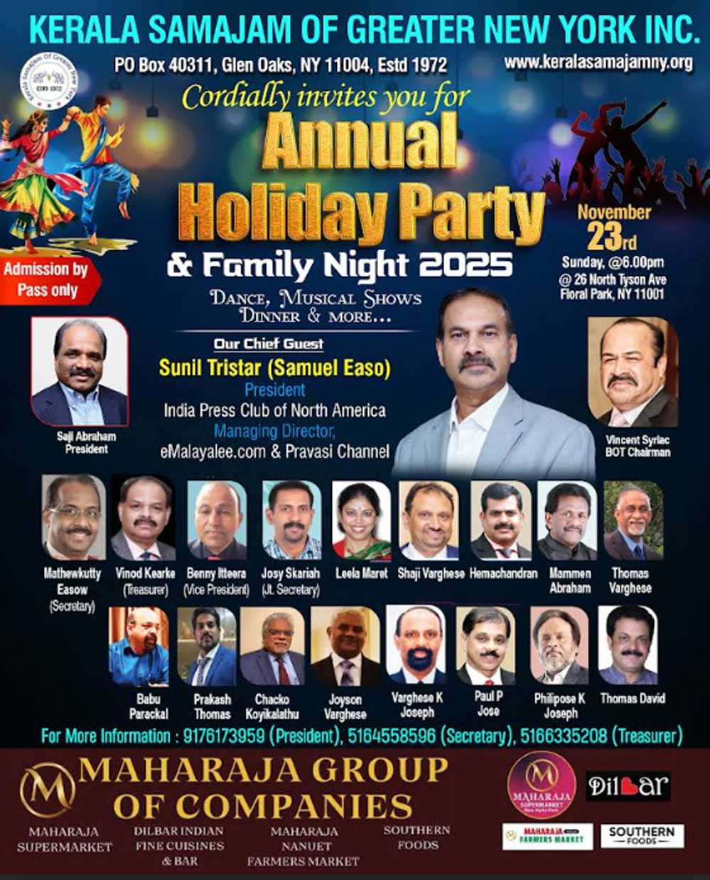 കൂടുതൽ വിവരങ്ങൾക്ക് ബന്ധപ്പെടുക: (1). Saji Abraham, President – 917-617-3959 (2). Mathewkutty Easow, Secretary – 516-455-8596 (3). Vinod Kearke, Treasurer – 516-633-5208 (4). Benny Itteera, Vice President – 516-859-5756 (5). Josy Skaria, Joint Secretary – 516-675-9592 (6). Vincent Syriac, BOT Chairman – 516-508-8297 (7). Leela Marett, Souvenir Chief Editor – 646-539-8443.