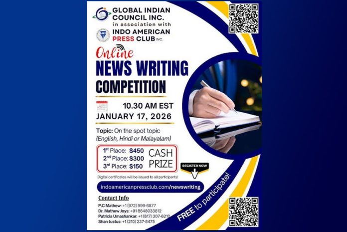 ഡാളസ് :ലോകമെമ്പാടുമുള്ള എഴുത്തുകാർക്കായി ഗ്ലോബൽ ഇന്ത്യൻ കൗൺസിലും (GIC) ഇൻഡോ അമേരിക്കൻ പ്രസ് ക്ലബ്ബും (IAPC) സംയുക്തമായി ഓൺലൈൻ ലൈവ് ന്യൂസ് റൈറ്റിംഗ് മത്സരം സംഘടിപ്പിക്കുന്നു. ധാർമ്മിക പത്രപ്രവർത്തനവും ക്രിയാത്മക ചിന്തയും പ്രോത്സാഹിപ്പിക്കുകയാണ് ഈ സംരംഭത്തിന്റെ ലക്ഷ്യം.