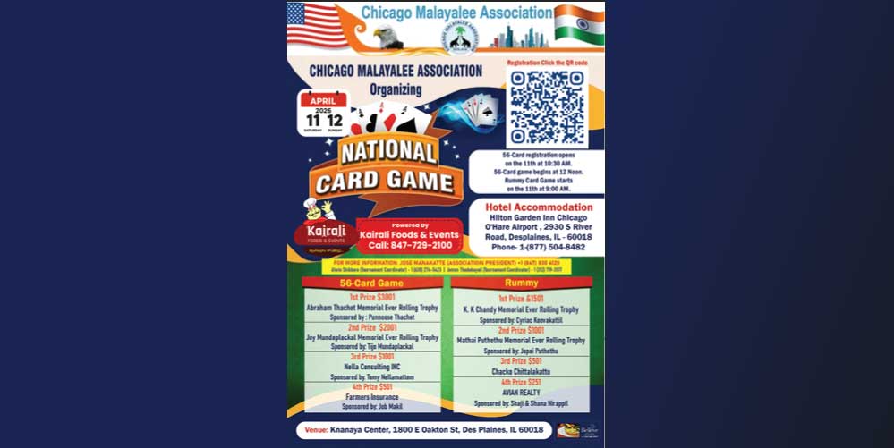 ചിക്കാഗോ : ചിക്കാഗോ മലയാളി അസോസിയേഷന്റെ ആഭിമുഖ്യത്തില് അരങ്ങേറുന്ന നാഷണല് 56 & റമ്മി ചീട്ടുകളി മത്സരത്തിന്റെ ഒരുക്കങ്ങള് അവസാന ഘട്ടത്തില്. 2026 ഏപ്രില് 1 1 ശനിയാഴ്ച രാവിലെ 10 ന് ചിക്കാഗോയിലെ ഡെസ്പ്ലെയിന്സില് ഉള്ളക്നാനായ സെന്ററില് വച്ച് 56 ന്റെ രജിസ്ട്രേഷന് ആരംഭിക്കുകയും 11.30 ന് രജിസ്ട്രേഷന് അവസാനിക്കുന്നതായിരിക്കും. തുടര്ന്ന് കൃത്യം 12 മണിക്ക് ഗെയിം ആരംഭിക്കുന്നതായിരിക്കുമെന്ന് സംഘാടകസമിതി അറിയിക്കുന്നു. ഇതിനോടകം 56 ഗെയിമിന് 52 ഓളം ടീമുകള് രജിസ്റ്റര് ചെയ്തിരിക്കുന്നു.