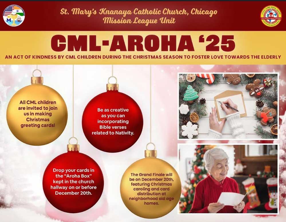 ചെറുപുഷ്പ മിഷൻ ലീഗിന്റെ ആഭിമുഖ്യത്തിൽ ക്രിസ്തുമസിനൊരുക്കമായി അറോഹാ 2025 എന്ന പേരിൽ ക്രിസ്തുമസ് ആശംസാകാർഡുകൾ തയ്യാറാക്കി ക്രിസ്തുമസ് കരോളുമായി ഇടവകയുടെ സമീപ പ്രദേശങ്ങളിലുള്ള നേഴ്സിങ്ങ് ഹോമുകൾ ഡിസംബർ 20 ശനിയാഴ്ച സന്ദർശിക്കും.