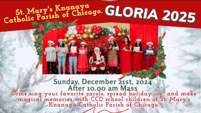 ചിക്കാഗോ : സെന്റ് മേരീസ് ക്നാനായ കത്തോലിക്കാ ഇടവകയിൽ ക്രിസ്തുമസിനോടനുബന്ധിച്ച് പൊതുവായ ക്രിസ്തുമസ് കരോൾ ആഘോഷങ്ങൾ സംഘടിപ്പിക്കുന്നു. ഡിസംബർ 21 ഞായറാഴ്ച രാവിലെ പത്തുമണിക്കുള്ള കുർബ്ബാനയ്ക്ക് ശേഷമാണ് ഇടവകയുടെ മതബോധന സ്കൂളിലെ കുട്ടികളും വിവിധ മിനിസ്ട്രികളും കൂടാരയോഗങ്ങളും ചേർന്ന് വിപുലമായ പൊതുവായ കരോൾ ആഘോഷങ്ങൾ പാരിഷ് ഹാളിൽ സംഘടിപ്പിക്കുന്നത്. ആഘോഷങ്ങളുടെ ഭാഗമായി ക്രിസ്തുമസ് കരോൾ ഗാനാലാപനവും വൈവിധ്യമാർന്ന വിനോദപരിപാടികളും സംഘടിപ്പിക്കും.