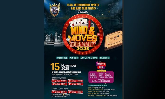 ഹൂസ്റ്റൺ: സംഘാടക മികവ് കൊണ്ടും ജന പങ്കാളിത്തം കൊണ്ടും ജന ശ്രദ്ധയാകർഷിച്ച അന്താരാഷ്ട്ര വടംവലി സീസൺ – 4 ന്റെ വൻ വിജയത്തിന് ശേഷം ടെക്സാസ് ഇന്റർനാഷണൽ സ്പോർട്സ് ആൻഡ് ആർട്സ് ക്ലബ് (TISAC) “മൈൻഡ് & മൂവ്സ് ടൂർണമെന്റ് 2025” സംഘടിപ്പിക്കുന്നു.