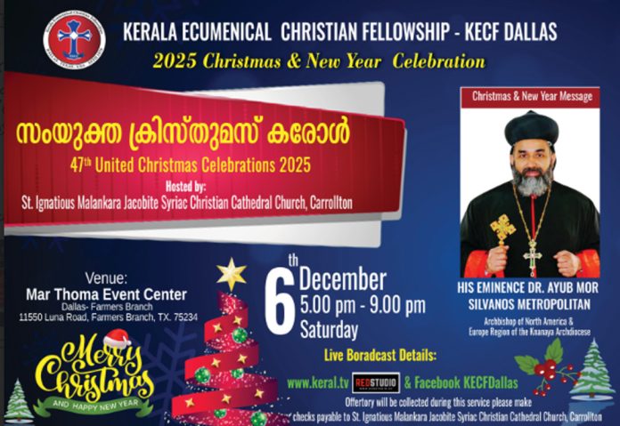 ഡാളസ്: കേരള എക്ക്യൂമെനിക്കൽ ക്രിസ്ത്യൻ ഫെല്ലോഷിപ്പിന്റെ (KECF) നേതൃത്വത്തിൽ ഡാളസിൽ നടത്തപ്പെടുന്ന നാല്പത്തി ഏഴാമത് സംയുക്ത ക്രിസ്തുമസ് – പുതുവത്സരാഘോഷങ്ങൾ ഡിസംബർ 6 ശനിയാഴ്ച്ച വൈകിട്ട് 5 മണിക്ക് ഡാളസിലെ മാർത്തോമ്മ ഇവന്റ് സെന്ററിൽ (11550 Luna Road, Farmers Branch, Tx 75234) വെച്ച് നടത്തപ്പെടും.