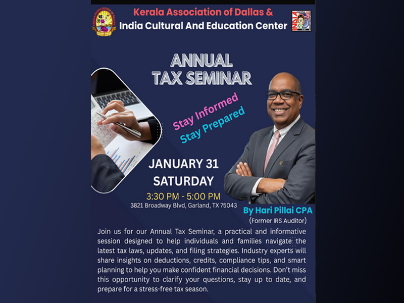 കേരള അസോസിയേഷൻ ഓഫ് ഡാളസും ഇന്ത്യ കൾച്ചറൽ ആൻഡ് എഡ്യൂക്കേഷൻ സെന്ററും സംയുക്തമായി സംഘടിപ്പിക്കുന്ന വാർഷിക ടാക്സ് സെമിനാർ ജനുവരി 31 ശനിയാഴ്ച നടക്കും. പുതിയ നികുതി നിയമങ്ങൾ, ഫയലിംഗ് രീതികൾ എന്നിവയെക്കുറിച്ച് വ്യക്തികൾക്കും കുടുംബങ്ങൾക്കും വ്യക്തമായ ധാരണ നൽകുന്നതിനായാണ് ഈ സെമിനാർ സംഘടിപ്പിക്കുന്നത്.