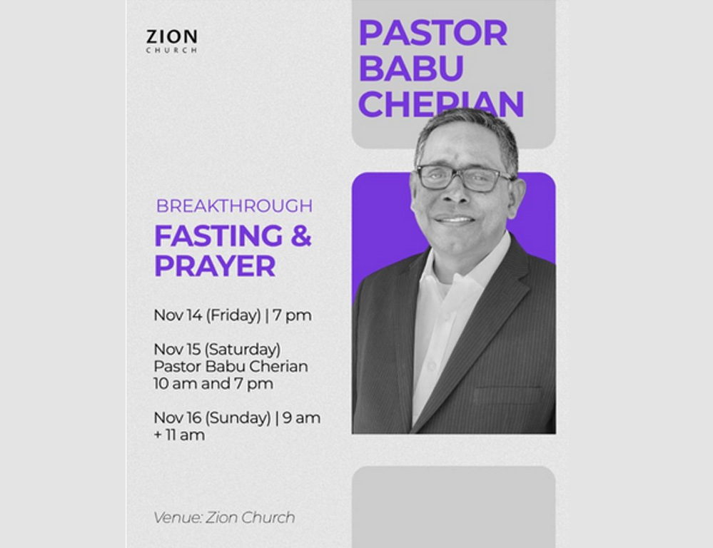 ഡാളസ്: ഡാളസ് സയോൺ ചർച്ചിൻ്റെ ആഭിമുഖ്യത്തിൽ നവംബർ 14 വെള്ളിയാഴ്ച മുതൽ – 16 ഞായറാഴ്ച വരെ ഉപവാസ പ്രാർത്ഥനകളും, പ്രത്യേക കൂടി വരവുകളും സഭാ ആരാധനാലയത്തിൽ (1620 E. Arapaho Road, Richardson, TX) നടക്കും.