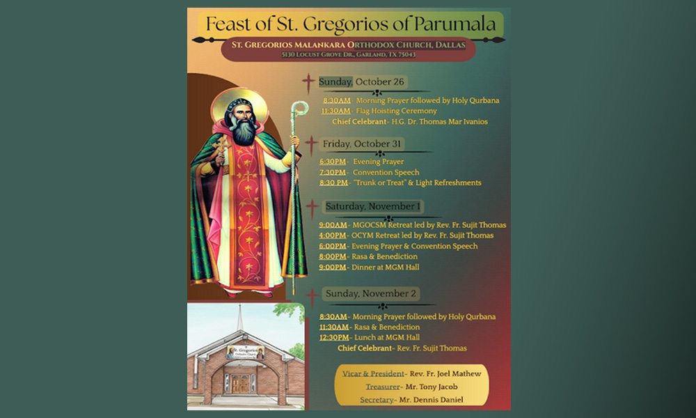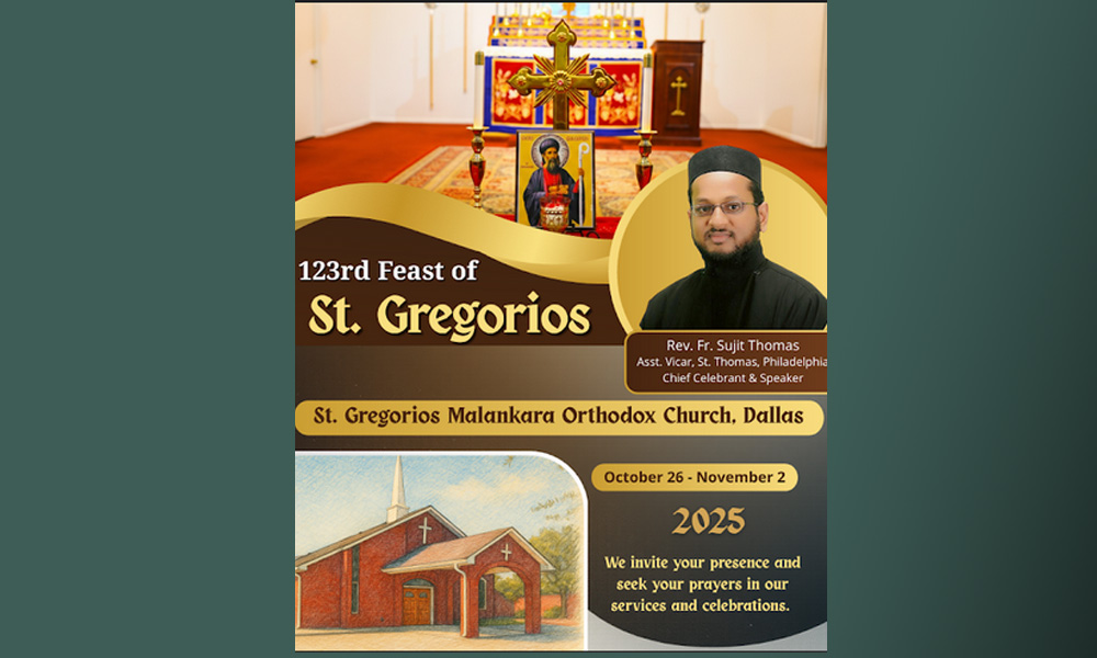 ഡാളസ്: മലങ്കര ഓർത്തഡോക്സ് സഭയുടെ പ്രഥമ പരിശുദ്ധനായ പരുമല തിരുമേനിയുടെ 123-ാമത് ഓർമ്മപ്പെരുന്നാൾ ഡാളസിലെ സെന്റ് ഗ്രിഗോറിയോസ് മലങ്കര ഓർത്തഡോക്സ് ദേവാലയത്തിൽ (130 Locust Grove Rd., Garland, TX 75043.) ഒക്ടോബർ 26 മുതൽ നവംബർ 2 വരെ ഒരാഴ്ചക്കാലം നീണ്ടുനിൽക്കുന്ന ഭക്തിനിർഭരമായ ശുശ്രൂഷകളോടെ ആചരിക്കുന്നു.