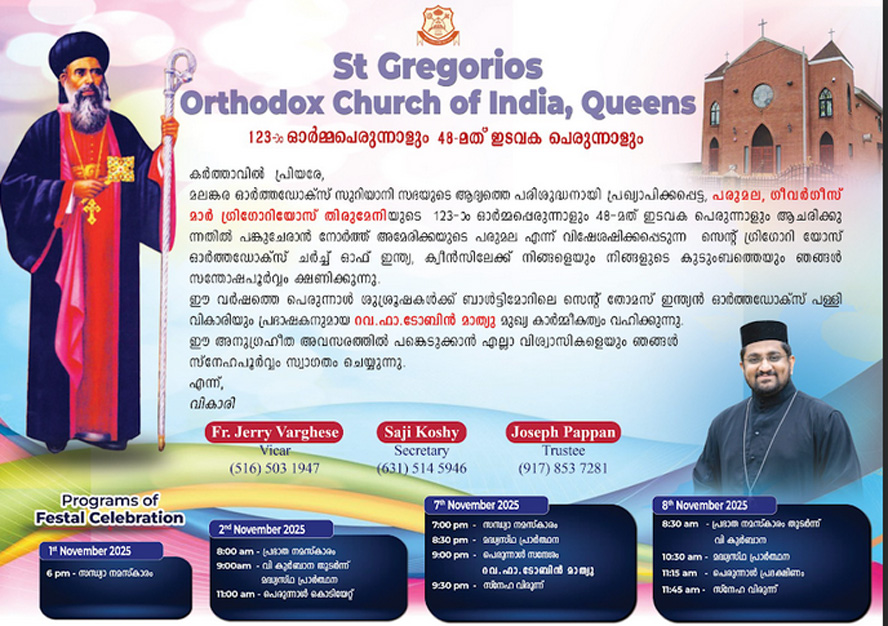 ന്യൂയോർക് : മലങ്കര ഓർത്തഡോൿസ് സഭയുടെ പ്രഥമ പ്രഖ്യാപിത പരിശുദ്ധനായ ഗീവര്ഗീസ് മാർ ഗ്രീഗോറിയോസ് തിരുമേനിയുടെ നൂറ്റിഇരുപത്തിമൂന്നാമതു (123th)ഓർമ്മപ്പെരുന്നാളും നാല്പ്പതെട്ടാമതു (48th) ഇടവകപ്പെരുന്നാളും അമേരിക്കയിലെ പരുമല എന്നറിയപ്പെടുന്ന ക്വീൻസ് St ഗ്രീഗോറിയോസ് ഓർത്തഡോൿസ് ഇടവകയിൽ വെള്ളി,ശനി (Nov-7,8)ദിവസങ്ങളിൽ നടത്തപ്പെടുന്നു .