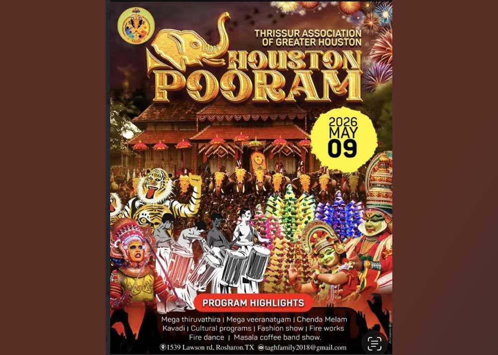 സമൂഹവും അഭിനിവേശവും അഭിമാനവും ഉള്ളിടത്തെല്ലാം സംസ്കാരം അഭിവൃദ്ധി പ്രാപിക്കുമെന്നതിന്റെ ശക്തമായ ഓർമ്മപ്പെടുത്തലാണിത്. തൃശ്ശൂരിന്റെ താളവും നിറവും ചൈതന്യവും പ്രതിധ്വനിക്കുന്ന ഈ ദിവസം ഈ നാഴികക്കല്ലായ ആഘോഷത്തിന്റെ ഭാഗമാകാൻ ഹ്യൂസ്റ്റൺ തൃശ്ശൂർ മലയാളി അസോസിയേഷൻ കുടുംബങ്ങളെയും സുഹൃത്തുക്കളെയും അഭ്യുദയകാംക്ഷികളെയും സവിനയം, സഹർഷം സ്നേഹാദരങ്ങളോടെ ക്ഷണിക്കുന്നു. താളമേളങ്ങൾ മുഴങ്ങട്ടെ, വിളക്കുകൾ മിഴിതുറക്കട്ടെ , ആകാശം പ്രകാശപൂരിതമാകട്ടെ – തൃശ്ശൂർ പൂരം 2026 അതിന്റെ എല്ലാ മഹത്വത്തോടെയും സൗഹൃദവും, സാഹോദര്യവും ഹ്യൂസ്റ്റണിൽ പൂവണിയട്ടെ പൂത്തുലയട്ടെ.