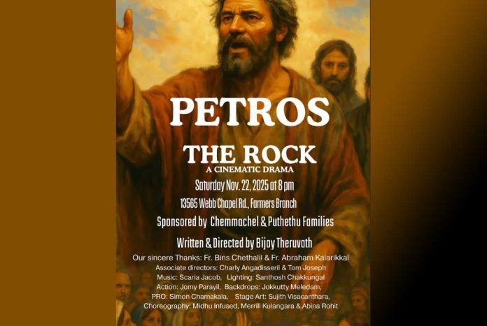 ഡാളസ് : ബൈബിളിലൂടെയുള്ള യാത്രയും അനുഭവങ്ങളും അപ്പസ്‌തോലന്മാരുടെ പ്രവൃത്തികളും തമ്മിലുള്ള സമാനതകൾ വിശദീകരിക്കുകയും ചെയ്യുന്ന ഈ നാടകത്തിൽ ആദ്യകാല ക്രൈസ്തവസഭയുടെ എറ്റവും ശ്രദ്ധേയരായ പ്രചാരകൻമാരിൽ ഒരാളായിരുന്ന പത്രോസ് (പെട്രോസ്) കേന്ദ്ര കഥാപാത്രമാകുന്ന നാടകം ശനിയാഴ്ച വൈകുന്നേരം ഫ്രാർമേഴ്‌സ് ബ്രാച്ചിലെ വെബ് ചാപ്ൽ റോഡിലെ ക്നാനായ ചർച്ചിൽ (13565 Webb Chapel Rd, Farmers Branch, TX 75234)