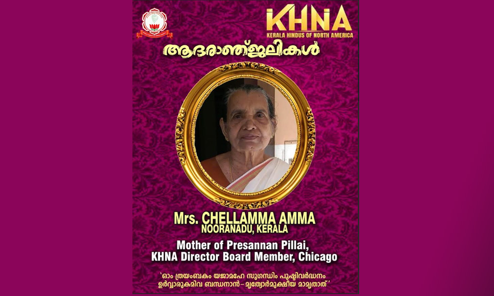 കേരള ഹിന്ദുസ് ഓഫ് നോർത്ത് അമേരിക്കയുടെ നേതൃനിരയോടെപ്പം കഴിഞ്ഞ രണ്ടു പതിറ്റാണ്ടിലേറെ കാലമായി നിസ്വാർത്ഥമായി പ്രവർത്തിക്കുകയും സാമ്പത്തിക പരാധീനതയുള്ള മലയാളി വിദ്യാർത്ഥികൾക്ക് സ്കോളർഷിപ് നല്കുന്നതുൾപ്പെടെയുള്ള ജീവകാരുണ്യ പ്രവർത്തനങ്ങൾക്ക് രൂപം നൽകുകയും, അമേരിക്കൻ മലയാളികളുടെ വിവിധ പൊതുമണ്ഡലങ്ങളിൽ സജീവ സാന്നിധ്യവും , ഇപ്പോഴത്തെ കെ.എച്ച്.എൻ.എ. ഡയറക്ടർ ബോർഡ് മെമ്പറുമായ പ്രസന്നൻ പിള്ളയുടെ മാതാവ് ചെല്ലമ്മ അമ്മയുടെ നിര്യാണത്തിൽ പ്രസിഡന്റ് ടി.ഉണ്ണികൃഷ്ണന്റെ അധ്യക്ഷതയിൽ കൂടിയ കെ.എച്ച്.എൻ.എ. നേതൃയോഗം അനുശോചിച്ചു.