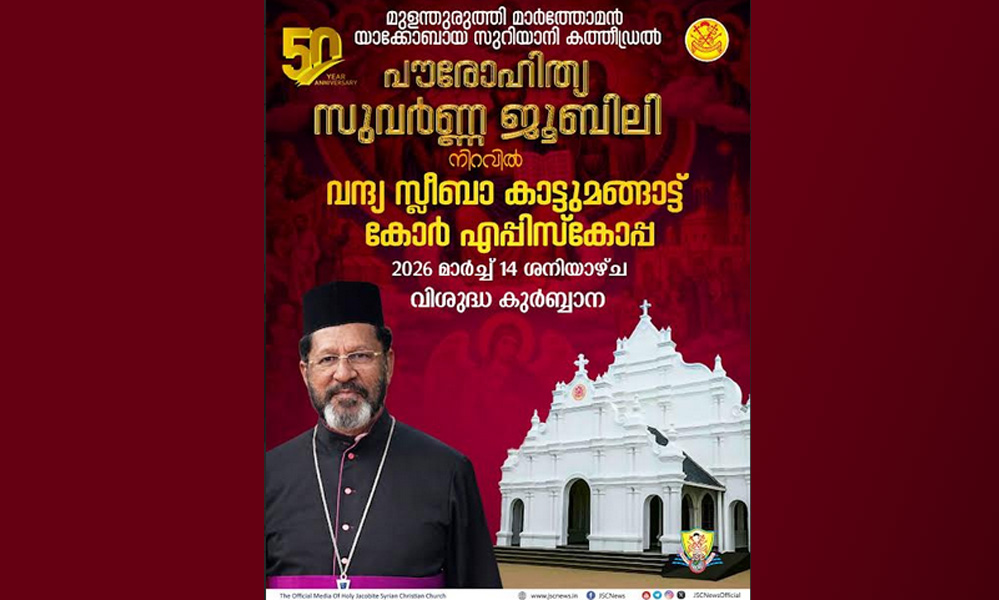 പൗരോഹിത്യ സുവർണ്ണ ജൂബിലി ദിനമായ ഇന്ന് (മാർച്ച് 14 ശനി) രാവിലെ 7 മണിക്ക് വന്ദ്യ സ്ലീബാ കാട്ടുമങ്ങാട്ട് കോർ എപ്പിസ്കോപ്പ ഇടവകയായ മുളന്തുരുത്തി മാർത്തോമൻ യാക്കോബായ സുറിയാനി കത്തീഡ്രലിൽ വിശുദ്ധ കുർബ്ബാന അർപ്പിക്കും. യാക്കോബായ സുറിയാനി ഓർത്തഡോക്സ് സഭയുടെ ഔദ്യോഗിക മാധ്യമ വിഭാഗമായ ജെ.എസ്.സി ന്യൂസിലൂടെ തൽസമയ സംപ്രേഷണം ചെയ്യും.