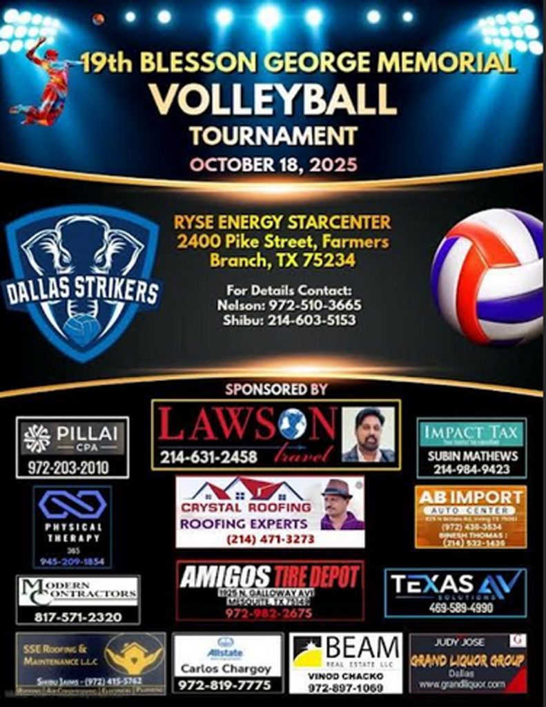 ഫാർമേഴ്സ് ബ്രാഞ്ച്, ടെക്‌സാസ് : മലയാളി വോളിബോൾ പ്രേമികൾ ആവേശത്തോടെ കാത്തിരിക്കുന്ന 19-ാമത് ബ്ലെസ്സൺ ജോർജ്ജ് മെമ്മോറിയൽ വോളിബോൾ ടൂർണമെൻ്റ് നാളെ (ഒക്ടോബർ 18, 2025, ശനിയാഴ്ച) ഫാർമേഴ്സ് ബ്രാഞ്ചിലെ റൈസ് എനർജി സ്റ്റാർസെന്ററിൽ (2400 Pike Street, Farmers Branch, TX 75234) വെച്ച് നടക്കും.