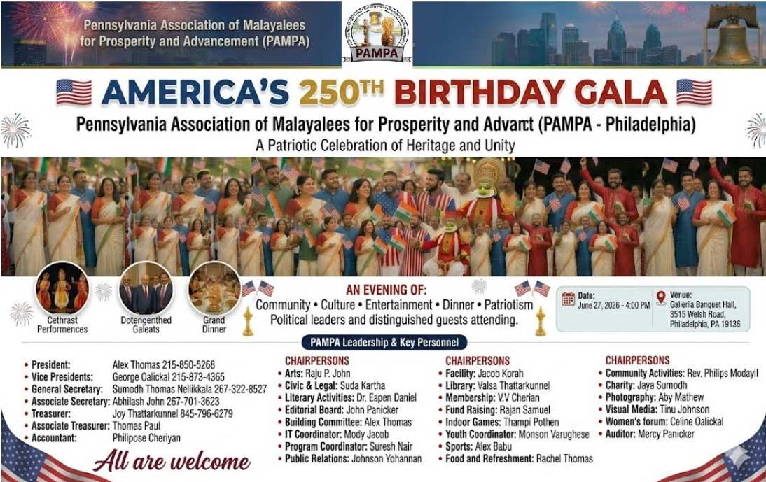ഫിലഡൽഫിയ: പെൻസിൽവാനിയ അസോസിയേഷൻ ഓഫ് മലയാളീസ് ഫോർ പ്രോസ്പെരിറ്റി ആൻഡ് അഡ്വാൻസ്മെന്റ് (PAMPA Philadelphia)യുടെ ആഭിമുഖ്യത്തിൽ അമേരിക്കയുടെ 250-ാം സ്വാതന്ത്ര്യദിനാഘോഷത്തോടനുബന്ധിച്ച് വിപുലമായ സാംസ്കാരിക പരിപാടി സംഘടിപ്പിക്കുന്നു.