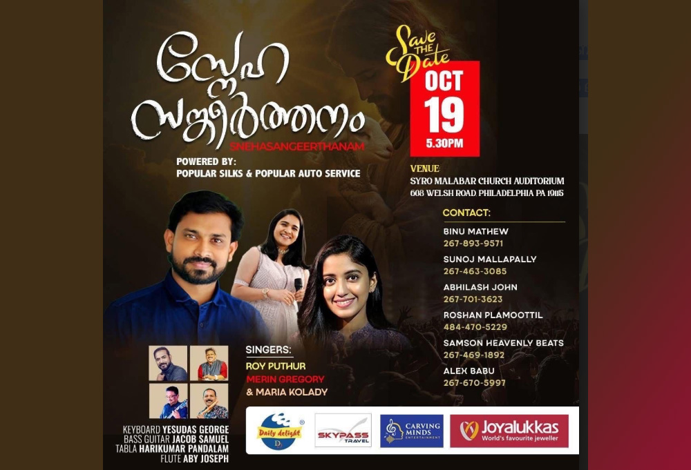 ഫിലാഡൽഫിയ: സംഗീതവും സൗഹൃദവും നിറഞ്ഞ സായാഹ്നത്തിനായി സ്നേഹസംഗീർത്തനം എന്ന സംഗീതവിരുന്ന് 2025 ഒക്ടോബർ 19-ന് ഞായറാഴ്ച വൈകുന്നേരം 5:30-ന് ഫിലാഡൽഫിയയിലെ Syro Malabar Church Auditorium, 608 Welsh Road, Philadelphia, PA 19115-ൽ അരങ്ങേറുന്നു.