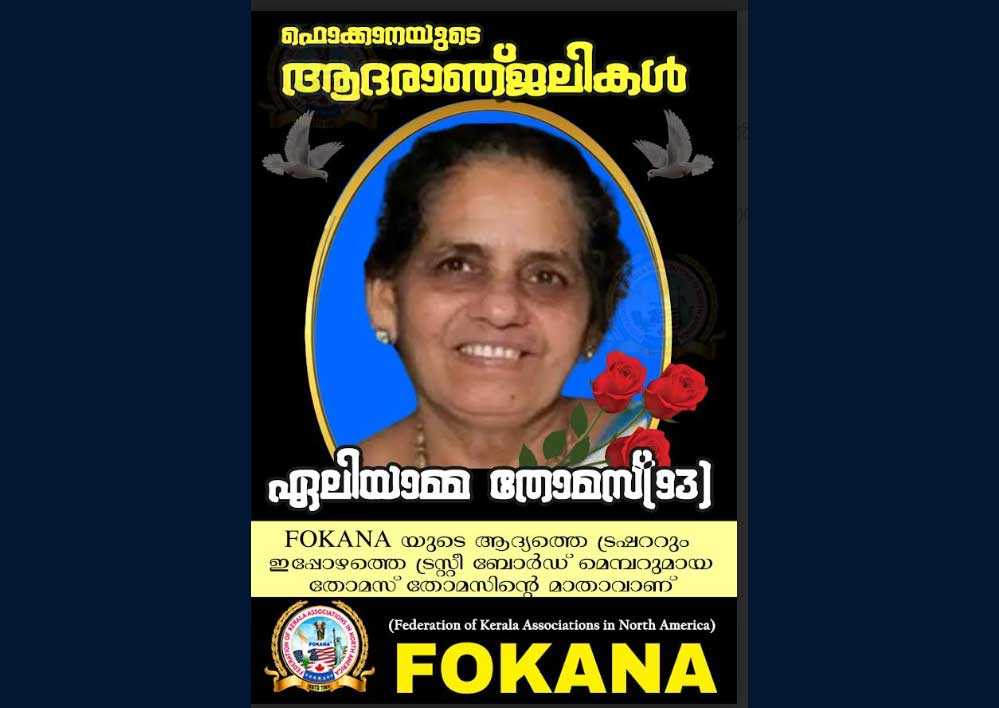 ന്യൂ യോർക്ക് : ഫൊക്കാനയുടെ ആദ്യത്തെ ട്രഷററും ഇപ്പോഴത്തെ ട്രസ്റ്റീ ബിർഡ് മെമ്പറുമായ തോമസ് തോമസിന്റെ (പാലത്ര) മാതാവ് ഏലിയാമ്മ തോമസിന്റെ നിര്യാണത്തിൽ ഫൊക്കാന അനുശോജനം രേഖപ്പെടുത്തി .