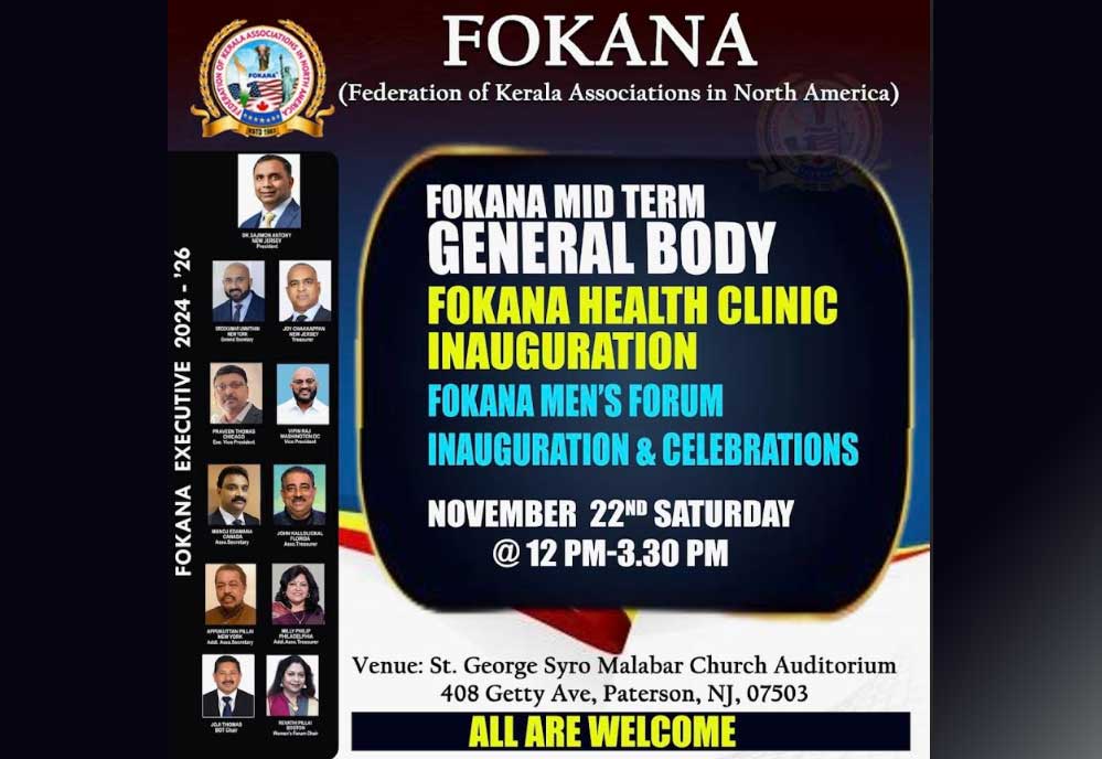 ന്യൂ യോർക്ക് : നോര്ത്ത് അമേരിക്കയിലെ മലയാളി സംഘടനകളുടെ സംഘടനയായ ഫൊക്കാനയുടെ (ഫെഡറേഷൻ ഓഫ് കേരളാ അസ്സോസിയേഷൻസ് ഇൻ നോർത്ത് അമേരിക്ക) മിഡ്ടെം ജനറല് ബോഡി മീറ്റിംഗ് 2025 നവംബർ 22 ,ശനിയാഴ്ച ഉച്ചക്ക് 12 മണി മുതൽ സെന്റ്. ജോർജ് സിറോ മലബാർ ചർച്ച് ഓഡിറ്റോറിയത്തിൽ ( 408 Getty Avenue, Paterson, NJ 07503) വെച്ച് നടത്തുന്നതാണ് എന്ന് പ്രസിഡന്റ് സജിമോൻ ആന്റണി, സെക്രട്ടറി ശ്രീകുമാർ ഉണ്ണിത്താൻ എന്നിവർ അറിയിച്ചു.