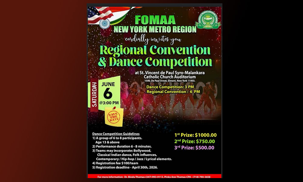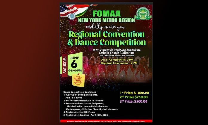 ന്യൂയോർക്ക്: അമേരിക്കയിലെയും കാനഡയിലെയും മലയാളീ സംഘടനകളുടെ ഏറ്റവും വലിയ അംബ്രല്ലാ സംഘടനയായ ഫോമായുടെ (FOMAA – Federation of Malayalee Associations of Americas) ന്യൂയോർക്ക് മെട്രോ റീജിയൻറെ 2024-2026 വർഷത്തെ ദ്വൈവാർഷിക സമാപന കൺവെൻഷൻ ജൂൺ 6 ശനിയാഴ്ച ഉച്ചയ്ക്ക് ശേഷം മൂന്നു മണി മുതൽ എൽമോണ്ടിലുള്ള സെൻറ് വിൻസെൻറ് ഡീപോൾ സീറോ മലങ്കര കത്തോലിക്കാ കത്തീഡ്രൽ ആഡിറ്റോറിയത്തിൽ വച്ച് (1500 DePaul Street, Elmont, NY 11003) നടത്തപ്പെടുന്നു.