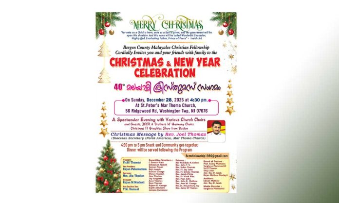 ന്യൂ ജേഴ്സി ∙ നോര്ത്ത് ന്യൂ ജേഴ്സിയിലെ ആദ്യകാല എക്യുമെനിക്കല് ക്രിസ്തീയ സംഘടനയായ ബര്ഗന് കൗണ്ടി മലയാളി ക്രിസ്ത്യന് ഫെലോഷിപ്പിന്റെ 40ാമത് ക്രിസ്തുമസ് ന്യൂ ഈയര് ആഘോഷങ്ങള് 2025 ഡിസംബര് 28 ഞായറാഴ്ച വൈകുന്നേരം 4.30 ന് വാഷിംഗ്ടണ് ടൗണ്ഷിപ്പ് സെന്റ് പീറ്റേഴ്സ് മാര്ത്തോമ്മാ പള്ളിയില്വെച്ച് (St. Peter’s Mar Thoma Church, 56 Ridgewood Road, Washington Township, NJ 07676) നടത്തപ്പെടും. മാര്ത്തോമ്മാ സഭയുടെ നോര്ത്ത് അമേരിക്കന് ഭദ്രാസന സെക്രട്ടറിയായ റവ. ജോയല് തോമസ് ക്രിസ്തുമസ് നവവത്സര സന്ദേശം നല്കും. വിവിധ സഭാ വിഭാഗങ്ങളിലും ഇടവകകളിലും നിന്നുമുള്ള ഗായക സംഘങ്ങളും ബ്രദേഴ്സ് ഇന് ഹാര്മൊണിയും ജെ. സി. സി. ആര് ഗായകസംഘവും ക്രിസ്തുമസ് ഗാനങ്ങള് അവതരിപ്പിക്കും. ബോസ്റ്റണില് നിന്നും എത്തുന്ന സംഘം അവതരിപ്പിക്കുന്ന പുതുമയുള്ള ക്രിസ്തുമസ് ഐ.റ്റി. ഗ്രാഫിക്ക് ഷോയും ക്രമീകരിച്ചിട്ടുണ്ട്.