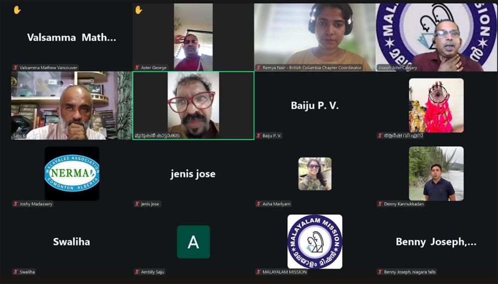മലയാളം മിഷൻ കാനഡയ്ക്ക് വേണ്ടിയുള്ള കോഓർഡിനേറ്റർ , സാജുകൊമ്പന്റെ സ്വാഗതത്തോടെ ആരംഭിച്ച മീറ്റിങ് , ഡയറക്ടർ മുരുകൻ കാട്ടാക്കട ഉത്ഘാടനം ചെയ്തു . കാനഡ കോഓർഡിനേറ്റർ ജോസഫ് ജോൺ കാൽഗറി അവതരിപ്പിച്ച പ്രവർത്തന റിപ്പോർട്ടിന് മലയാളം മിഷൻ രജിസ്ട്രാർ സ്വാലിഹ എം. വി പ്രാഥമിക മറുപടി നൽകി.