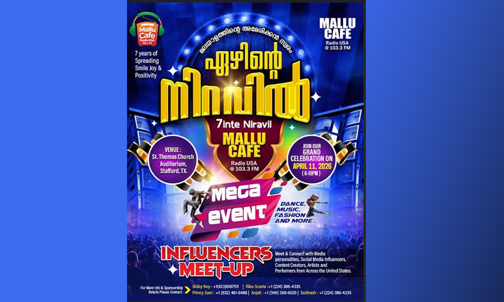 ഞങ്ങളുടെ അവിശ്വസനീയമായ സ്വാധീനം ചെലുത്തുന്നവരുടെയും കലാകാരന്മാരുടെയും പ്രത്യേക അതിഥികളുടെയും പേരുകൾ ഞങ്ങൾ ഉടൻ പ്രഖ്യാപിക്കും. ഏപ്രിൽ 11, 2026 വൈകുന്നേരം 6:00 – രാത്രി 10:00 ഹ്യൂസ്റ്റൻ സെന്റ് തോമസ് ചർച്ച് ഓഡിറ്റോറിയം മുഴുവൻ മലയാളി കുടുംബത്തിനും വേണ്ടിയുള്ള ഒരു ആഘോഷം എല്ലാ മല്ലു കഫേ സുഹൃത്തുക്കളും കുടുംബങ്ങളും ഒത്തുചേർന്ന് ഈ നാഴികക്കല്ല് ഞങ്ങളോടൊപ്പം ആഘോഷിക്കാൻ ഞങ്ങൾ സ്നേഹപൂർവ്വം ക്ഷണിക്കുന്നു. ഇത് ഞങ്ങളുടെ വാർഷികം മാത്രമല്ല – ഇത് നിങ്ങളുടെ ആഘോഷമാണ്. ഐക്യത്തിന്റെയും സ്വത്വത്തിന്റെയും പോസിറ്റിവിറ്റിയുടെയും.
