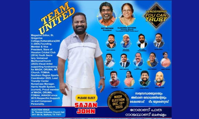 ഹൂസ്റ്റൺ: ഗ്രേറ്റർ ഹൂസ്റ്റൺ മലയാളി അസോസിയേഷന്റെ (MAGH) 2026-ലേക്കുള്ള ഭരണസമിതി തിരഞ്ഞെടുപ്പിൽ, റോയ് മാത്യു നയിക്കുന്ന ‘ടീം യുണൈറ്റഡ്’ (Team United) പാനലിൽ നിന്ന് പ്രമുഖ കായിക-സാംസ്കാരിക സംഘാടകനായ സാജൻ ജോൺ ജനവിധി തേടുന്നു.