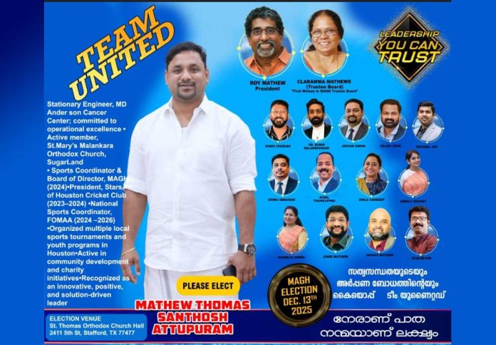 ഹൂസ്റ്റൺ: ഗ്രേറ്റർ ഹൂസ്റ്റൺ മലയാളി അസോസിയേഷന്റെ (MAGH) 2026-ലേക്കുള്ള തിരഞ്ഞെടുപ്പിൽ, റോയ് മാത്യു നയിക്കുന്ന ‘ടീം യുണൈറ്റഡ്’ (Team United) പാനലിൽ നിന്ന് പ്രമുഖ യുവജന-കായിക സംഘാടകനായ സന്തോഷ് ആറ്റുപുറം (മാത്യു തോമസ്) ജനവിധി തേടുന്നു.