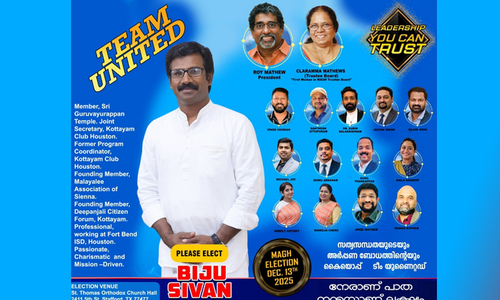 തിരഞ്ഞെടുപ്പ് വിവരങ്ങൾ: “നേരാണ് പാത, നന്മയാണ് ലക്ഷ്യം” എന്ന മുദ്രാവാക്യവുമായി എത്തുന്ന ‘ടീം യുണൈറ്റഡ്’ പാനലിൽ റോയ് മാത്യു (പ്രസിഡന്റ്), ക്ലാരമ്മ മാത്യൂസ് (ട്രസ്റ്റി ബോർഡ്) എന്നിവർക്കൊപ്പം വിനോദ് ചെറിയാൻ, സന്തോഷ് ആറ്റുപുറം, ഡോ. സുബിൻ ബാലകൃഷ്ണൻ, ജീവൻ സൈമൺ, സാജൻ ജോൺ, മൈക്കിൾ ജോയ്, ഷിനു എബ്രഹാം, സുനിൽ തങ്കപ്പൻ, അനില സന്ദീപ്, അമ്പിളി ആന്റണി, ബിജു ശിവൻ, ബനീജ ചെറു, ജിൻസ് മാത്യു, ഡെന്നിസ് മാത്യു തുടങ്ങിയ പ്രഗത്ഭരായ സ്ഥാനാർത്ഥികൾ അണിനിരക്കുന്നു. 2025 ഡിസംബർ 13-ന് ശനിയാഴ്ച സ്റ്റാഫോർഡ് സെന്റ് തോമസ് ഓർത്തഡോക്സ് ചർച്ച് ഹാളിൽ (2411 5th St, Stafford, TX 77477) വെച്ചാണ് തിരഞ്ഞെടുപ്പ് നടക്കുന്നത്.