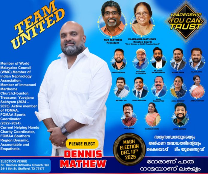 ഹൂസ്റ്റൺ: ഗ്രേറ്റർ ഹൂസ്റ്റൺ മലയാളി അസോസിയേഷന്റെ (MAGH) 2026-ലേക്കുള്ള ഭരണസമിതി തിരഞ്ഞെടുപ്പിൽ, റോയ് മാത്യു നയിക്കുന്ന ‘ടീം യുണൈറ്റഡ്’ (Team United) പാനലിൽ നിന്ന് ഡെന്നിസ് മാത്യു ജനവിധി തേടുന്നു.