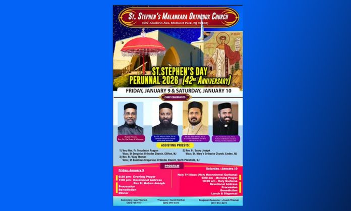 ന്യൂജേഴ്സി : മിഡ് ലാൻഡ് പാർക്ക് സെന്റ് സ്റ്റീഫൻസ് ഓർത്തഡോൿസ് ദേവാലയത്തിൽ വിശുദ്ധ സ്തെപ്പാനോസ് സഹദായുടെ തിരുനാൾ ആഘോഷങ്ങൾക്ക് ഇന്ന് തുടക്കം കുറിക്കും