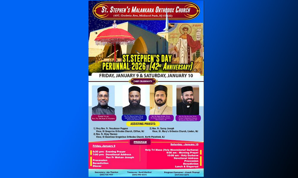 ന്യൂജേഴ്‌സി : മിഡ് ലാൻഡ്‌ പാർക്ക്‌ സെന്റ്‌ സ്റ്റീഫൻസ് ഓർത്തഡോൿസ്‌ ദേവാലയത്തിൽ വിശുദ്ധ സ്തെപ്പാനോസ് സഹദായുടെ തിരുനാൾ ആഘോഷ ചടങ്ങുകൾ ജനുവരി 9,10 (വെള്ളി /ശനി ) തീയതികളിൽ ക്രമീകരിച്ചിരിക്കുന്നു . ദേവാലയത്തിന്റെ നാല്പത്തിരണ്ടാം വാർഷികാഘോഷവും തിരുനാൾ ചടങ്ങുകളുടെ ഭാഗമായി ഒരുക്കിയിട്ടുണ്ട്