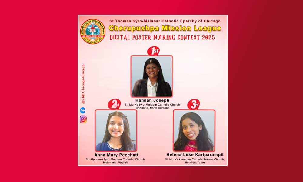 ചിക്കാഗോ: ചെറുപുഷ്‌പ മിഷൻ ലീഗ് ചിക്കാഗോ രൂപത സമിതി സംഘടിപ്പിച്ച ഡിജിറ്റൽ പോസ്റ്റർ നിർമാണ മത്സര വിജയികളെ പ്രഖ്യാപിച്ചു.