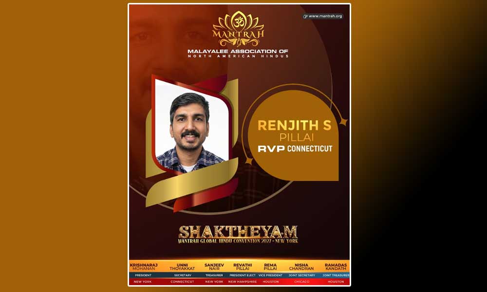 കണക്ടിക്കട്ട്: Malayalee Association of North American Hindus (മന്ത്ര – MANTRA) കണക്ടിക്കട്ട് റീജിയണൽ വൈസ് പ്രസിഡന്റായി ശ്രീ രഞ്ജിത് എസ് പിള്ള ചുമതലയേറ്റതായി സംഘടന ഔദ്യോഗികമായി അറിയിച്ചു.