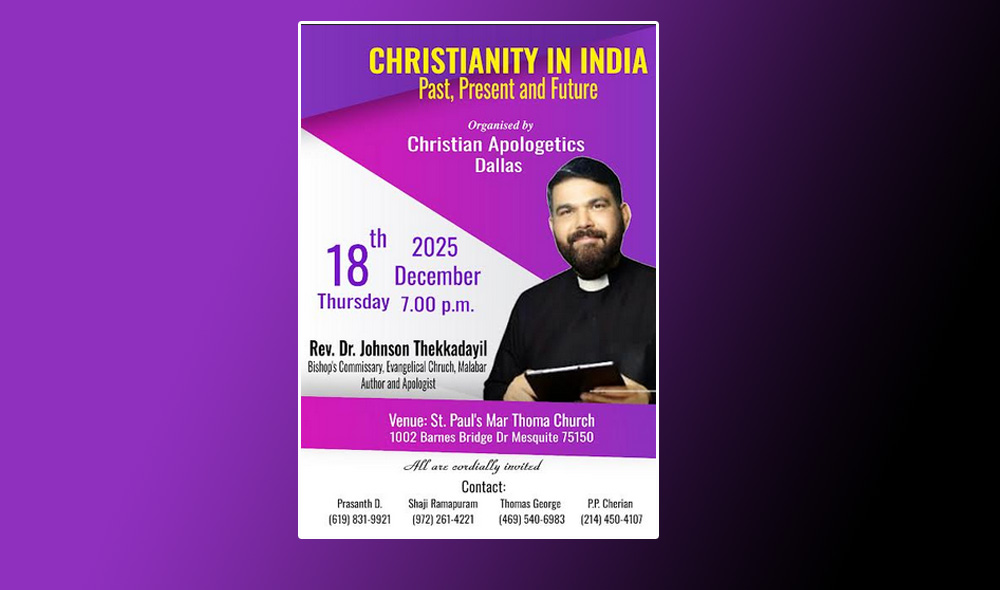 ഡാലസ്: ക്രിസ്ത്യൻ അപ്പോളജറ്റിക്സ് ഡാലസിന്റെ നേതൃത്വത്തിൽ ഇന്ത്യയിലെ ക്രൈസ്തവ സമൂഹത്തിന്റെ ഭൂതകാലം, വർത്തമാനകാലം, ഭാവികാലം എന്ന വിഷയത്തെ അധികരിച്ച് ഒരു സെമിനാർ ഡിസംബർ 18 വ്യാഴായ്ച്ച വൈകിട്ട് 7 മണിക്ക് ഡാലസ് സെന്റ്.പോൾസ് മാർത്തോമ്മ ദേവാലയത്തിൽ വെച്ച് (1002 Barnes Bridge Rd, Mesquite, Tx 75150) നടത്തപ്പെടുന്നു.