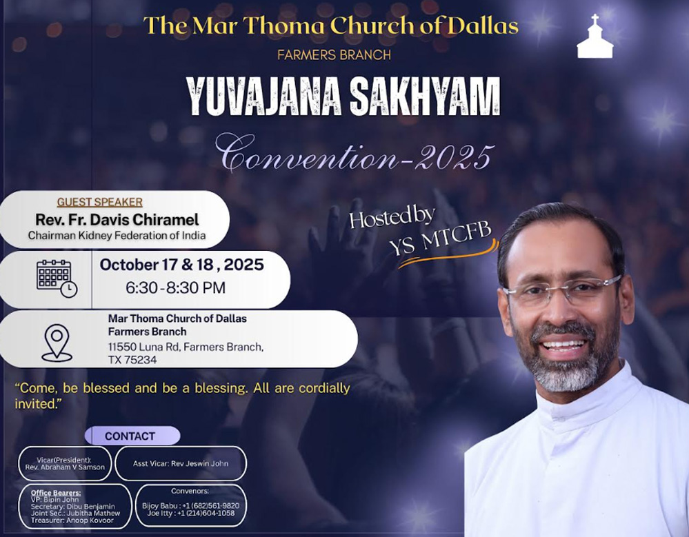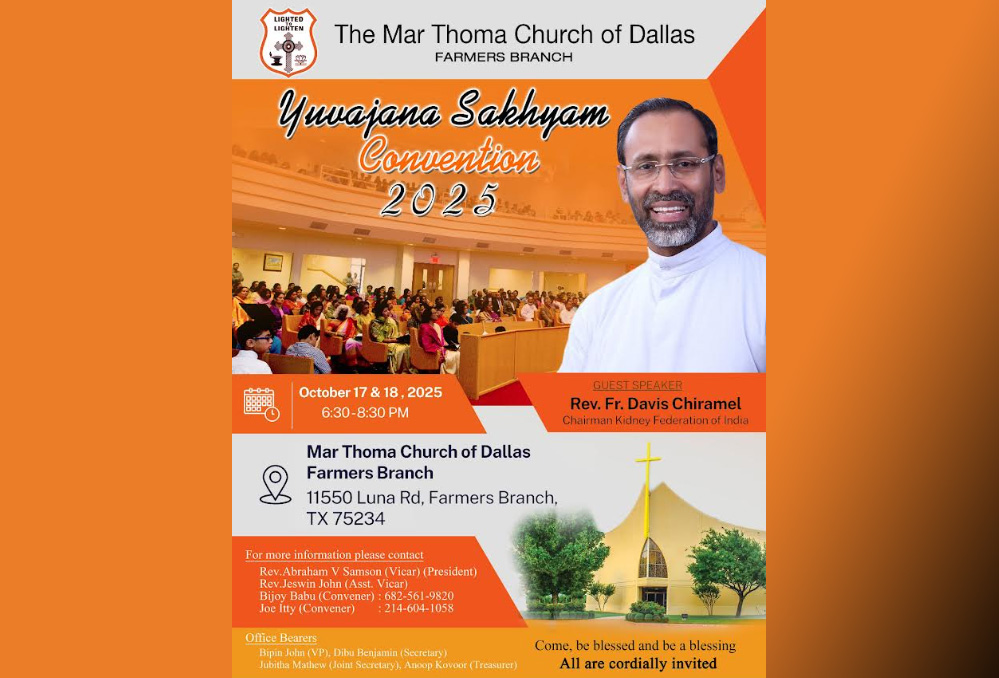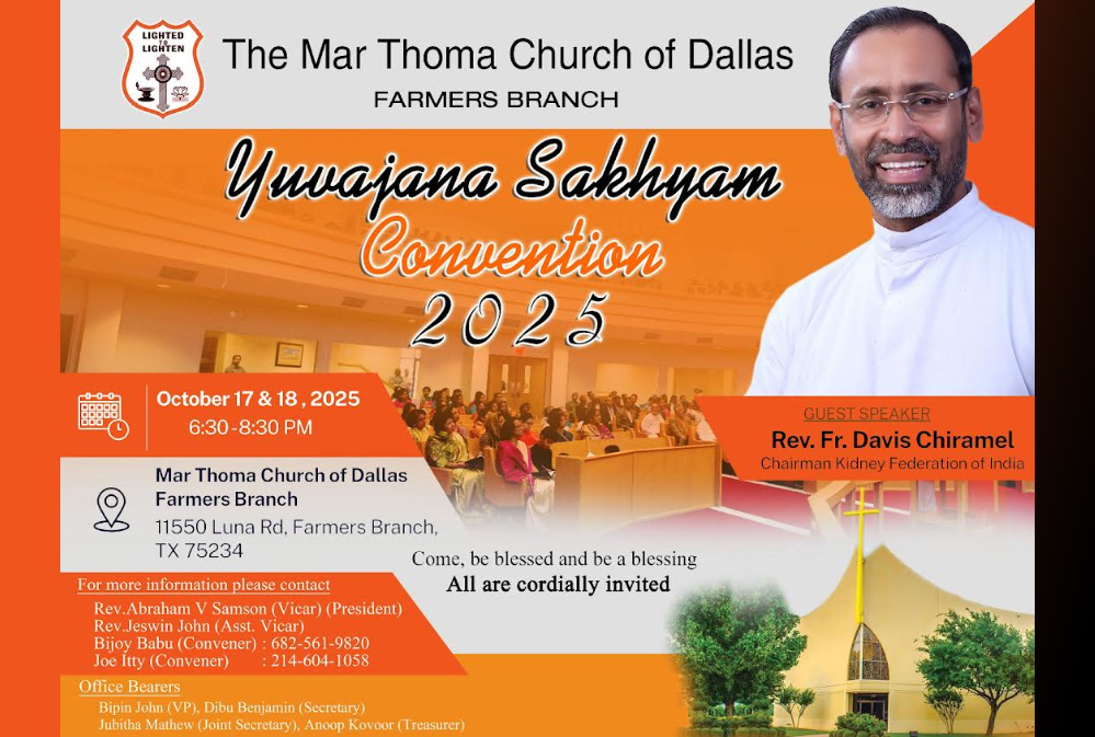 ഫാർമേഴ്സ് ബ്രാഞ്ച് മാർത്തോമാ യുവജന സഖ്യത്തിന്റെ ആഭിമുഖ്യത്തില് ഒക്ടോബർ 17th, 18th (വെള്ളി ,ശനി ) തീയതികളില് മാർത്തോമാ ചർച്ച് ഓഫ് ഡാളസ് ഫാർമേഴ്സ് ബ്രാഞ്ച് ഇടവകയിൽ വച്ച് നടത്തപ്പെടുന്ന ബൈബിള് കണ്വന്ഷണില് റവ. ഫാ ഡേവിസ് ചിറമേൽ തിരുവചനപ്രഘോഷണം നടത്തും.